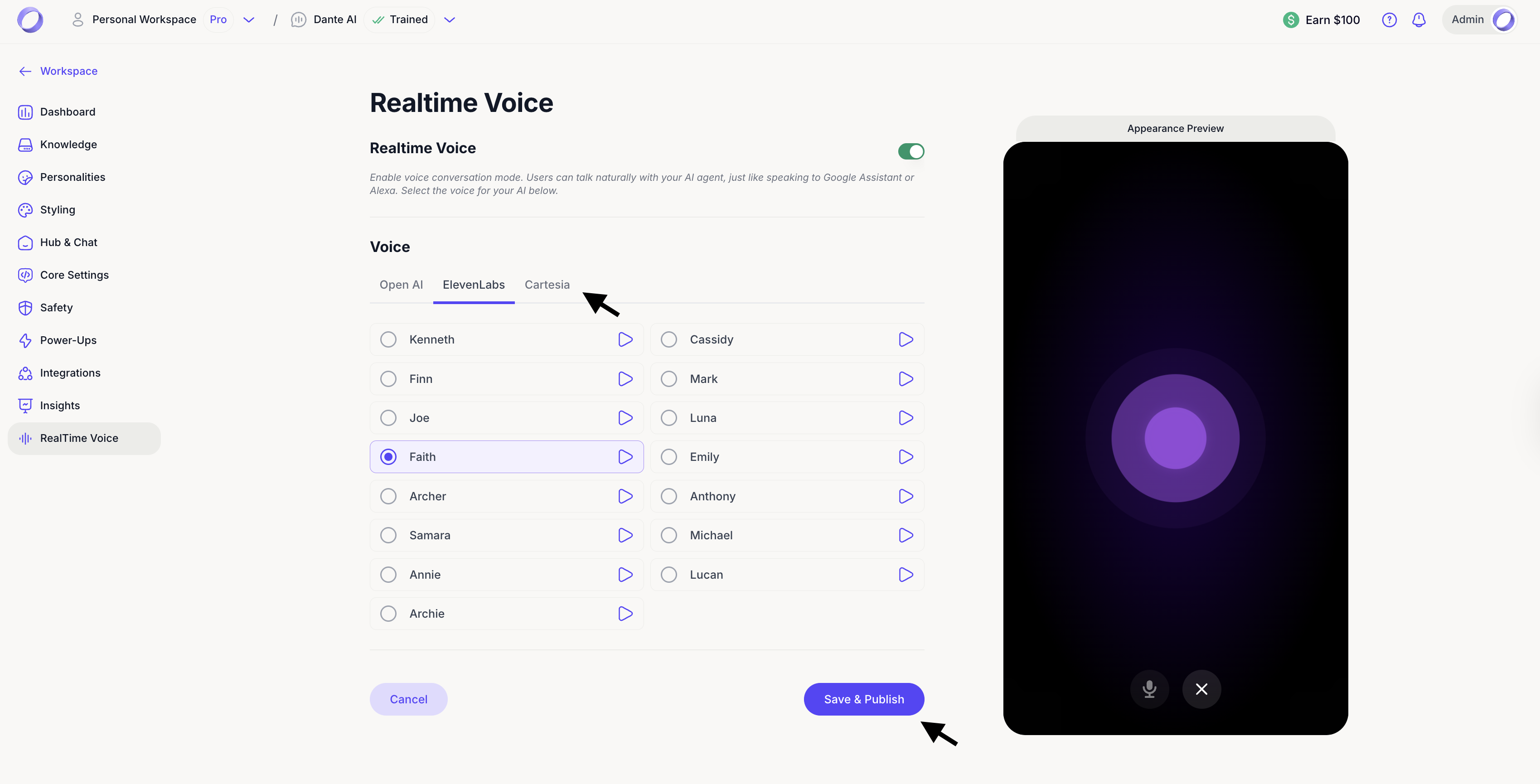 You can preview each voice using the play icon before choosing. - Click Save & Publish to apply your changes.