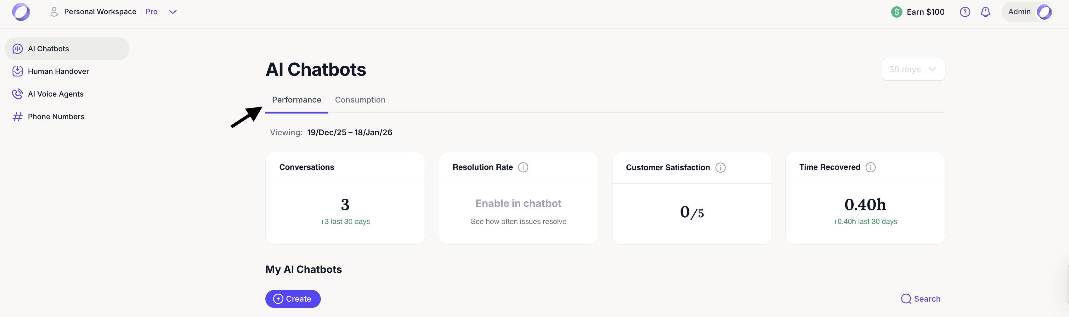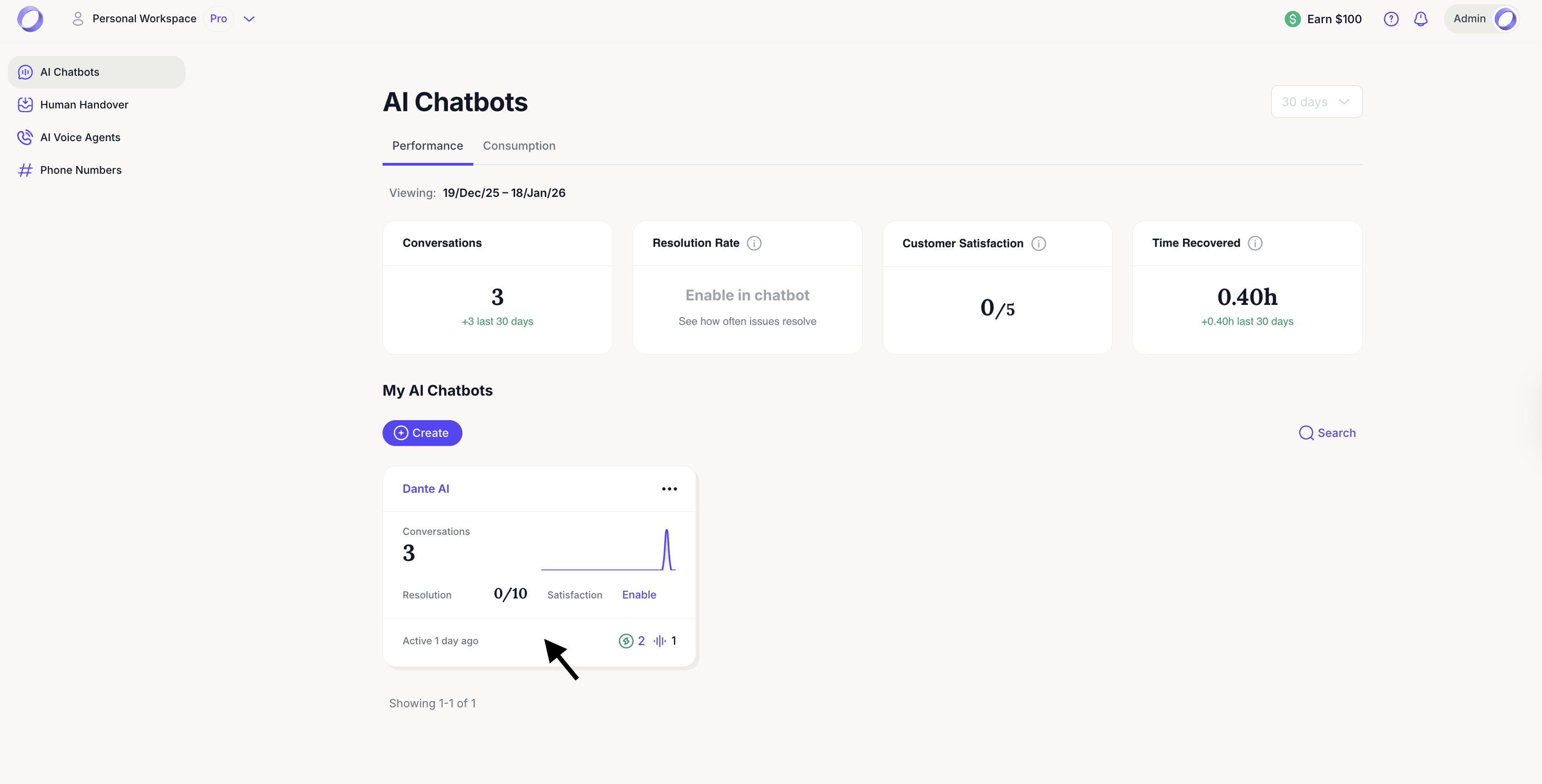 When you log in to Dante AI, you’ll first land in the Workspace. The Workspace is your central view for managing all your AI chatbots and accessing high-level performance data before editing any individual chatbot.